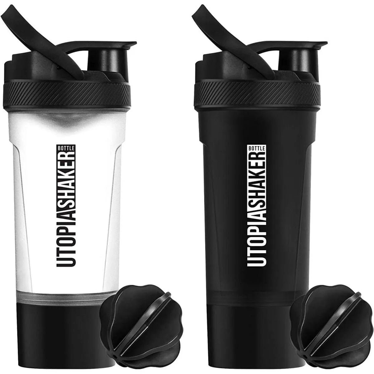 TOP RATED SHAKER BOTTLE FOR ALL YOUR PROTEINS NEEDS This shaker bottle is the ultimate solution for all your protein needs. You can have your favorite drink on the go with this spacious bottle in use which can hold a great volume of around 700 ml (24 ounces). The protein shaker bottle keeps you hydrated as it’s highly portable to keep you energized for long, whether you are in the Gym or on the Olympics ground. The vibrant colored shaker bottle is available in blue color. The bottle is suitable for carrying cold as well as hot liquids. Also, you can use it for storing pancake batter, milkshakes, smoothies, fiber drinks, mashed eggs, and more. P.S. It is recommended to hand wash the shaker bottle with tap water and dry it off completely before the first use.  YOUR PERFECT GYM PARTNER It’s a very easy-to-use bottle that comes with a lid opening system. The lid on the mouth of the bottle keeps your protein shake safe. The liquid can be poured either through the smaller mouth near the lid opener or through the larger mouth which is accessible after opening the top cap. The bottle can sustain liquid of lukewarm temperature which is up to 40℃. The bottle may deform and can lose its shape and design if the liquid content is beyond the recommended temperature. The bottle comes with an inbuilt filter that filters out large chunks of the solution. The twist and lock mechanism in the bottle allows easy storage of protein powder. Also, the shaker bottle comes with a whisk mixer ball that assists in stirring your solution  SOLID CONSTRUCTION FOR BETTER UTILITY The design of bottle is made of food-grade plastic that keeps the content secure. The crack-resistant material protection makes sure that it’s useful for a long.  VALUE PACK This Bottle comes in Two complementing colors which makes it a Value pack to add up to your gym collection.The bottle is designed from non-slippery material to offer a firm grip that’s easy to hold.Anti-slip polish is coated on the surface to enhance the bottle’s grip further.